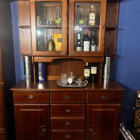 Yläosassa lasiovelliset kaapit, keskellä avohyllyt ja alaosassa kaapit säilytykseen. Kolmeosainen, osat irrallaan.