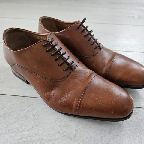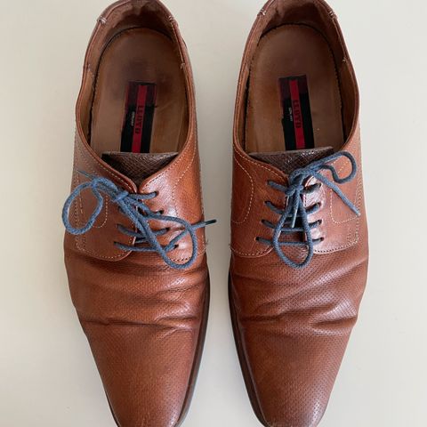 Primark juhlakengät, koko 42. Ruskeat nauhalliset kengät, joissa brogue-tyylinen rei’itys. Päällinen näyttää mokkapintaiselta materiaalilta, pohjassa kuvioitu kumipohja. Sopivat juhla- ja siistimpään arkipukeutumiseen.