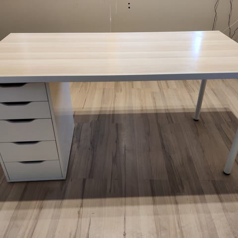 Hyväkuntoinen työpöytä lisäpalalla, jonka voi poistaa kokonaan tai vaihtaa puolta. Takana pieni virhe, pöydän kansi teipattu marmori teipillä. Lisäpalan leveys 40 cm. Pöydän alla erillinen johtokaukalo.