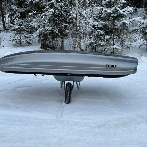 Hyvä thulen suksiboksi ei vihellä katolla muotoilunsa takia. Koko 195x77
