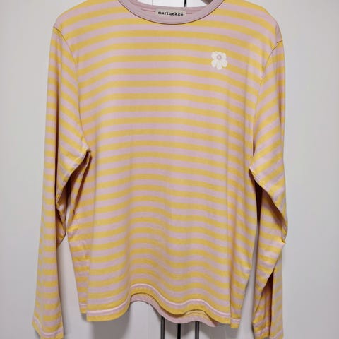 Marimekko Tasaraita Relaxed naisten paita. Koko XL. Vaaleanpunavalkoinen raidallinen kuosi ja pieni unikko edessä. Materiaali 100 % puuvillaa. Pitkähihainen malli, jossa pyöreä pääntie. Paita on ostettu uutena ja jäänyt erittäin vähälle käytölle.