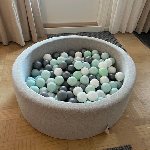 Mukana monivärisiä muovipalloja useissa väreissä.