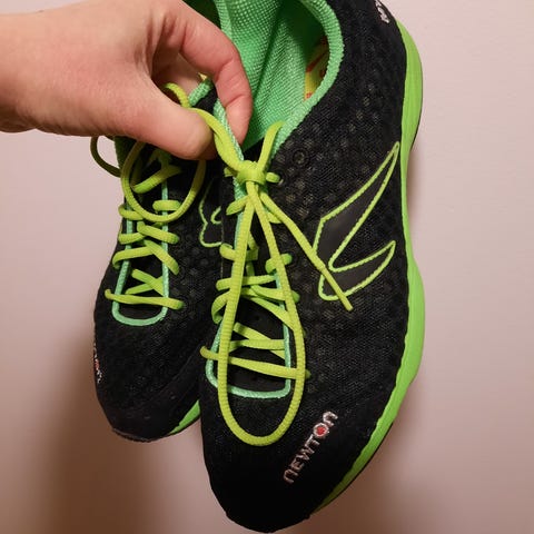 Ortopedisilla pohjilla varustetut lenkkarit, joista yksi nauha puuttuu