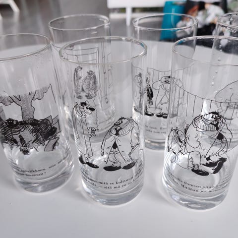 Erittäin hyväkuntoiset huumorilasit, yhdestä puuttuu tarra