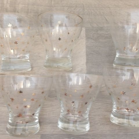 Korkeus 23.5 cm, 6 kpl laseja. Yhdessä lasissa pieni riksu. Postitus tai nouto