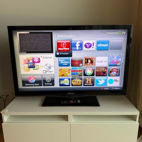 Musta litteä televisio, näytön koko arviolta noin 50 tuumaa. Televisio on sijoitettu valkoisen tv-tason päälle. Tarkempia teknisiä tietoja, kuten merkkiä, mallia tai tarkkaa tuumakokoa, ei ole nähtävissä kuvista.
