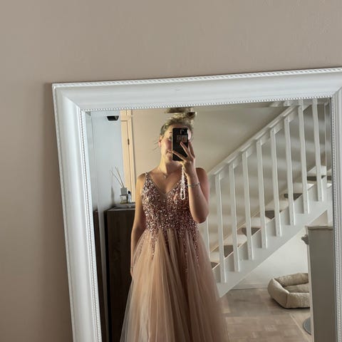 Myynnissä Zazabellan vuonna 2022 käytössä ollut wanhojen tanssi mekko. Avoin selkä, olkaimet sekä piilotaskut sivuilla.