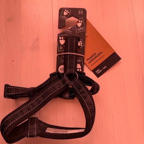 Muutaman kerran käytetyt Hurtta koiran valjaat, kaulanympärys/säädettävä pituus noin 45–55 cm. Vihreäsävyinen kuviollinen malli.
