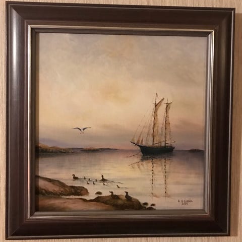 Tämä kiehtova öljymaalaus tarttuu talvimaiseman hiljaiseen ja melankoliseen tunnelmaan, luultavasti eurooppalaiseen kaupunkimaisemaan tai joenvarsikuvaan. Taiteilija käyttää hienostuneen ja hämärän värimaailman palettia, jota hallitsevat harmaat, sinivihreät, ruskeat ja vaaleankeltaisia hippusia, jotka heijastavat talvisen päivän hajavaloa. Puut, kaljuine oksineen, luovat etualalle mielenkiintoisen tekstuurin, kun taas taustalla olevat rakennukset, vain viitteellisiä ja sumuun hautautuneita, lisäävät syvyyttä sommitteluun.Joen tai kanavan varren stilisoitujen hahmojen esiintyminen viittaa rauhalliseen arkipäiväiseen toimintaan, joka on tyypillistä monille eurooppalaisille genrekohtauksille. Teoksen sivellinvedot ovat näkyviä ja matericaisia, antaen teokselle välittömyyden ja elinvoiman tunteen. Teos on asetettu ylelliseen kultakehykseen, jossa on kaiverruksia, mikä korostaa sen kauneutta ja tekee sen esillepanokelpoiseksi.