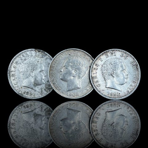 10 Centavos1915Kolikot › Yleisimmät liikkeessä olevat kolikot: System 1912-1916.Prata 835‰ • 2,5 g • ⌀ 20 mmKM# 563, Gomes# R 07, N# 111502 x 5 Escudoa1932–1951Kolikot › Yleisesti kiertoon tarkoitetut kolikot: Järjestelmä 1927–1968Prata 650‰ • 7 g • halkaisija 25,2 mmKM# 581, Gomes# R 35, N# 42624 x 2,50 Escudos1932–1951Kolikot › Yleisesti kiertoon tarkoitetut kolikot: Järjestelmä 1927–1968Prata 650‰ • 3,5 g • ⌀ 20,5 mmKM# 580, Gomes# R 30, N# 3710