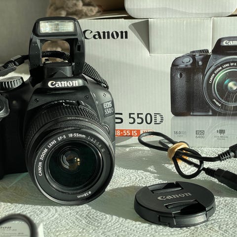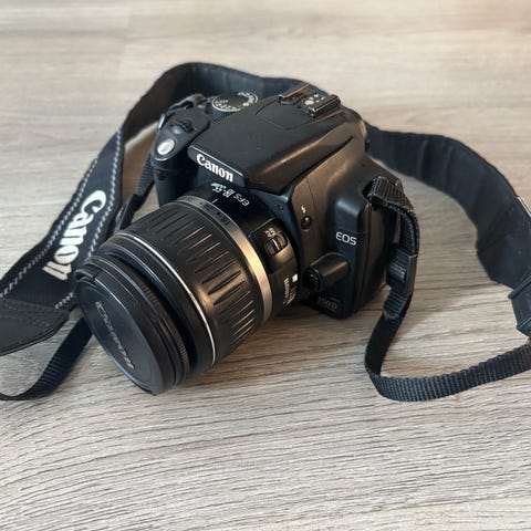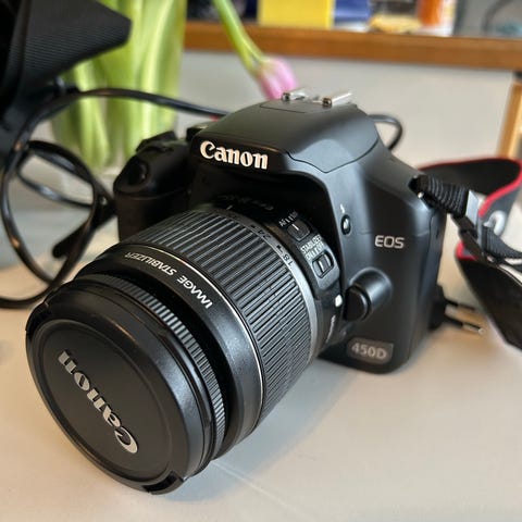 Canon EOS 450D järjestelmäkamera 18–55 mm objektiivilla.