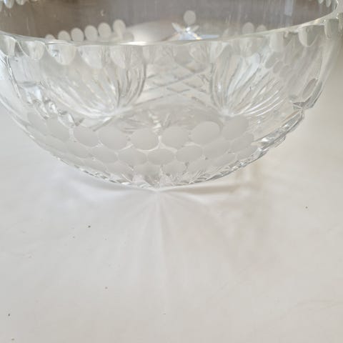 Kristallilasinen kulho koristeellisilla kaiverruksilla. Reunuksessa myös koristeellinen leikkaus. 2,5kg eli hyvin painava. Halkaisija n.22cm. Korkeus 11cm. Loistava esim juhlapöydän tarjoiluun. Nouto tai postitus (+postimaksu postin M-paketti 10,90€).
