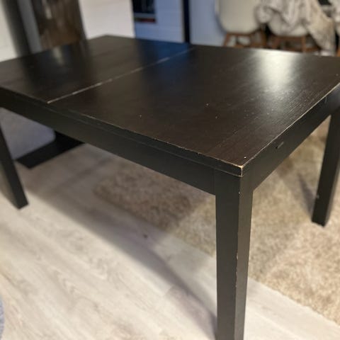 Myydään valkoinen Ikean Bjursta -ruokapöytä. Pituus 140cm. Mukana 2 jatkopalaa, pöydän saa jatkettua 180cm tai 220cm pituiseksi. Leveys 84cm, korkeus 74cm. Yhden jatkopalan reunassa kulumaa (kuva). Hinta 40e, nouto Turengista.