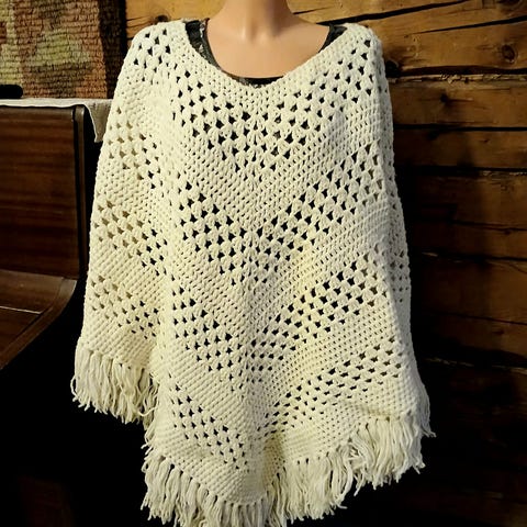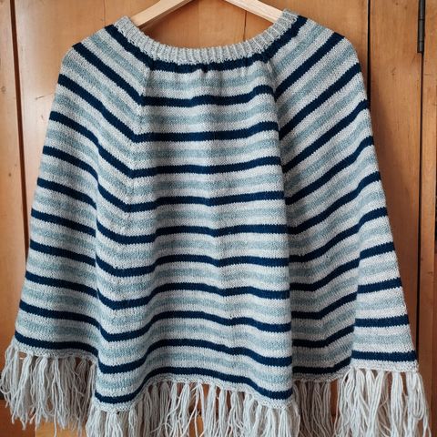 Tumman sininen kaunis poncho. Kiva nappikoriste toisella olkapäällä