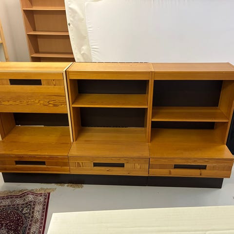 Kaksi-osainen hyllykkö, koivua. Tv tason saa halutessaan kaupan päälle, siinä pinnassa käytön jälkiä