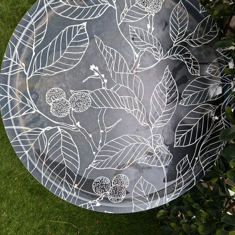 IKEA pyöreä tarjotin. Väri vaaleanpunainen, pinnassa valkoinen ympyräkuvio.