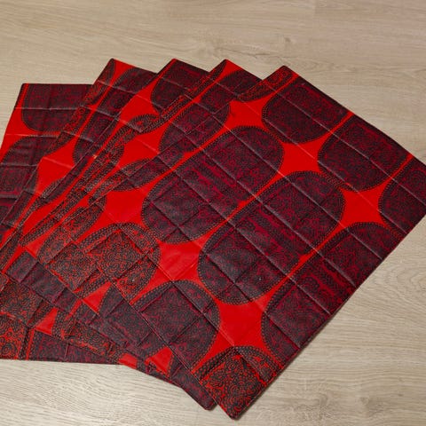 Marimekko tabletit, 6 kappaletta. Kuosi on muija, punainen/valkoinen, materiaali kerni/muovi/pehmustettu, käytetty, käytön jälkiä, katsothan kuvat.