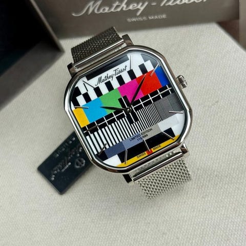 Upea Mathey Tissot -miestenkello, malli H7917TV. Kello toimii Quartz-koneistolla (Ronda). Huomiota herättävä kello väreineen ja kellotaulunsa ansiosta. Valmistettu rajoitetun erän, 999 kappaleen, mukaan. Huomioithan, että toimitettavan kappaleen numero 999:stä voi poiketa kuvassa näkyvästä mallista.Kello on mukavalla teräksisellä rannekkeella.Kello toimitetaan näytetyillä (valkoisilla) tarvikkeilla.Kellokoneisto: Kvartsi (Ronda)materiaali: teräsHalkaisija: noin 40 mm ilman kruunua.bandin pituus: noin 21 cm.Ikä: 2020+Se lähetetään vakuutettuna.Valokuvien ottaminen on osa kuvausta.