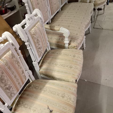 Puusepänliike Pekkarinen .Sohva lev.185cm,kork.85cm,2 nojatuolia lev.85cm ja pöytä kork.56cm,halk.80cm.Hyväkuntoiset,ei tahroja,kankaat ehjät.Pöydässä pari pientä painaumaa.