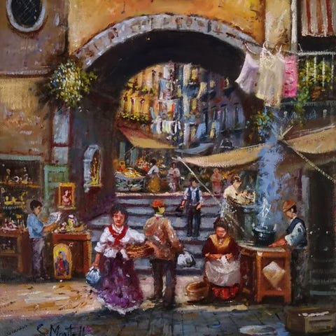 Upea mestarin A. Pecorellin öljyteos kankaalle 50 x 40, joka esittää viehättävän vanhan parigina? kohtauksen (iltapäivä Pariisissa). Upea maalaus, toteutettu lukuisilla hahmoilla ja värisävyillä; pehmeät ja materiset siveltimen vedot. Näkyy mestarin erinomainen maalaustaito, ihanat värit on upeasti sijoitettu toisiinsa, mikä tekee teoksesta harmonisen ja elegantin. Takaa löytyy signeeraus ja lyhyt elämäkerta taiteilijasta. Peräisin yksityiskokoelmasta ja toimitus on seurattavissa.