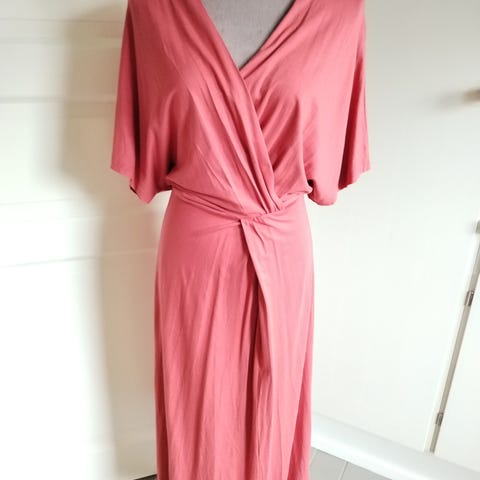 Mekossa on V-pääntie, lyhyet hihat ja edessä nappikiinnitys koko pituudelta. Vyötäröllä on irrotettava tai säädettävä solmittava vyö, jolla istuvuutta voi muokata. Helma on pohjepituinen. Sopii arkikäyttöön ja monenlaisiin tilanteisiin.