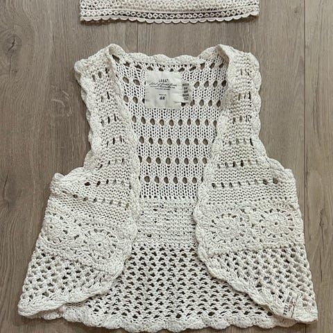 H&M valkoinen pörröliivi, 128. Kiinnittyy yhdellä napilla ylhäältä. En löydä moitteita.