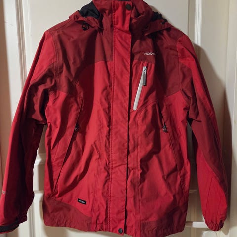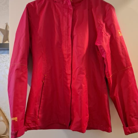 Naisten punainen ulkoilutakki, koko 38. Takissa on huppu ja pitkät hihat. Sopii yleiseen ulkoiluun ja arkipukeutumiseen viileämpiin säihin.