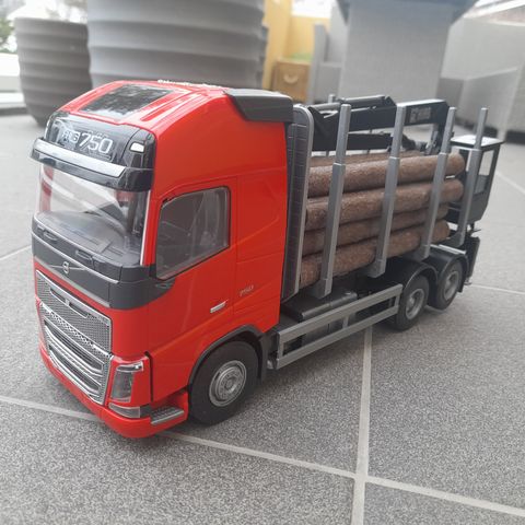 Emek lelu rekka puutavaraperävaunulla. Punainen kuorma-auton ohjaamo ja musta perävaunu, joissa useita akseleita. Mukana irrotettavat puutavaralastit.