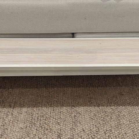 Myydään penkki, harmaa kangas, tummat puujalat.