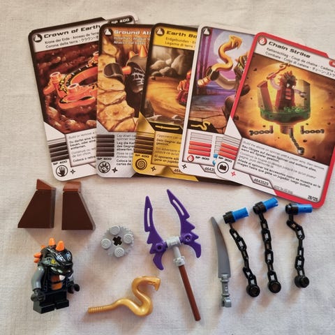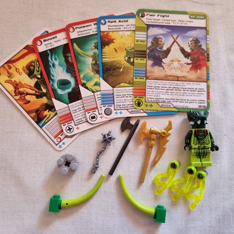 Kaikki osat ja kortit. Hahmon volemmissa kyljissä halkeama. Ei ohjeita.