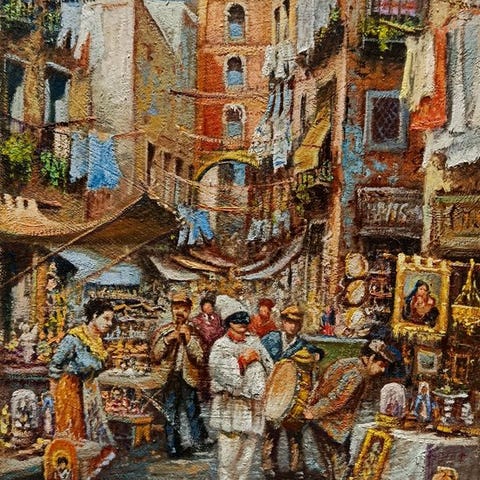 Kaunis ja upea öljy kankaalle, mitat 24 x 30, mestari Salvatore Montellan teos. Kuvassa on kaunis Napoli-kulma, ja kauniit värit kertovat erinomaisesta maalaustaidosta. Alareunassa on taiteilijan allekirjoitus.Peräisin yksityisomistuksesta ja seurattava lähetys.