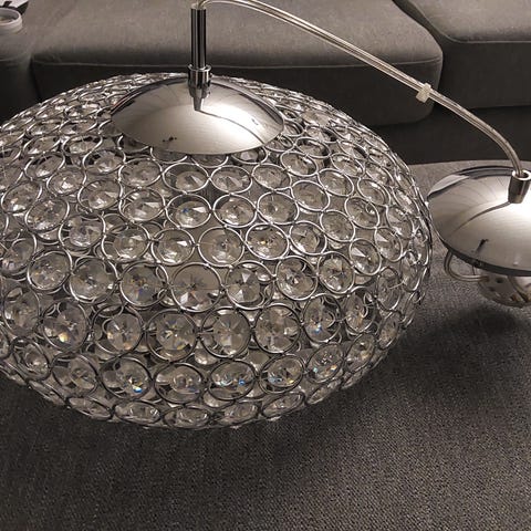 Tyylikäs ja laadukas riippuva kristallivalaisin. Melko painava ja siksi varustettu kolmella vaijerilla. Valaisimen halkaisija 38 cm.