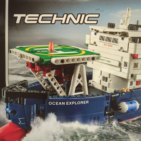 Lego Technic -rakennussarja 42064, jossa suuri tutkimus- tai pelastuslaiva. Settiin kuuluu laivan lisäksi pienempi helikopteri sekä sukellus- ja tutkimusvarusteita. Kaikki osat tallessa ja siisti ohjekirja.