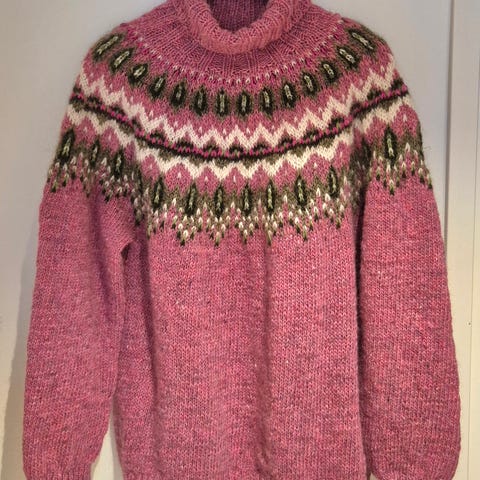 Kaksinkertaisesta plötylopista itse neulottu neule.