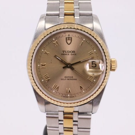 // HUOMAUTUS TARJOAJALLE //Kun kelloon on asennettu jälkimarkkinoiden osia tai toisen valmistajan alkuperäisosia, kelloa pidetään kustomoituna kellona. Tämä tarkoittaa, että kello voi sisältää komponentteja, jotka poikkeavat alkuperäisistä tehtaan osista. Kustomointi voi vaihdella suuresti, joten korostamme seuraavia mahdollisuuksia täyden läpinäkyvyyden takaamiseksi:- Jälkimarkkinaosat -Kellossa voi olla kolmannen osapuolen komponentteja (esim. kehykset, kellotaulu, viisarit, kristallit, ranneke ja jalokivien kiinnitykset), jotka eivät ole tuotemerkin omistajan valmistamia. Nämä osat lisätään usein esteettisistä syistä, mutta valmistaja ei pidä niitä alkuperäisinä.- Alkuperäisiä osia muista malleista -Jotkut osat (esim. kellotaulut tai rannekkeet) voivat olla peräisin muista saman brändin aidoista kelloista. Vaikka nämä osat ovat aitoja, ne eivät alun perin olleet tämän tietyn mallin tai viitenumeron yhteydessä, mikä saattaa vaikuttaa keräilyarvoon tai valmistajan huolto palvelun mahdollisuuksiin.- Ei-alkuperäisosat -Joissakin tapauksissa räätälöidyt kellot voivat sisältää osia, jotka eivät ole alkuperäisiä eivätkä merkin valmistamia. Nämä komponentit voivat vaikuttaa kellon arvoon.Mukautuskellot eivät välttämättä ole oikeutettuja merkin viralliseen huoltoon tai takuuseen. Kaikki tarjoukset tulee tehdä täysin tietoisina kuvatusta räätälöinnin tilasta.===============================================================Malli: Tudor Prince Date 74033, kaksivärinen kultakellotaulu, automaattinen urheilukelloAlkuperämaa: SveitsiRuostumaton teräsNoin: 2000-luvun jälkeenKellon näytön väri: kultaKotelon koko: 34 mm (ilman kruunua)Soveltuu jopa 18,5 cm ranteeseen. Ei ylimääräisiä linkkejä.Koneisto: Tudor (ETA) 2824-2 automaattinen koneistoVirrankesto: noin 38 tuntiaToiminnot: Ajan seuranta, automaattinen ja manuaalinen viritys, liukuvat osoittimet, päivämäärän näyttö, ruuvilukittava kruunu.**Tämän kellon vesitiiviyttä ei ole tarkistettu. Se ei ole suositeltava uinnille tai sukellukselle. Käytä varovaisuutta, kun pidät kelloa veden lähellä.**—// TOIMITUKSEN SISÄLLÖT //—Ei [sisältää jälkimarkkinointivärioranssi laatikon, kuten kuvissa näkyy]Alkuperäiset asiakirjat: Ei—// EHDOT //—Kulumaa kotelossa | ORIGINAL | : ** [lievä kuluma kotelon sivuilla. Kevyet naarmut kotelon sivulla noin klo 9]Kulumaa takakannessa | ORIGINAL | : ** [pieniä hiusnaarmuja ja kevyitä naarmuja]Käytön jälki Crystalissä | TUNTEMATON | : * [vain minimaalista kulumaa, reunan pienellä karheudella]Käytön jälkiä kellotaulussa | ORIGINAL | : ** ["SWISS MADE" on painettu klo kuuden kohdan alapuolella. Tulostus on erinomaisessa kunnossa. Kellotaulussa näkyviä käytön jälkiä, katso kuvat. Luminoivat pisteet ovat ehjät]Käytön jälkiä osoittimissa | ORIGINAL | : ** [metallin kulumaa. Luminisointimateriaali ehjä]Käytön jälkiä kehys | JÄLKI MARKKINA | : - [jälkimarkkinan kultauksella varustettu metallinen kehys]Rannekorun päällä | AFTERMARKET | : - [Jälkimarkkinoiden metallinen ranneke kultauksella]Kuluminen Keeperillä | JÄLKI-MARKKINAT | : -Kulumaa solkessa | ORIGINAL | : ** [Osan viite 62473. Hiusjälkiä ja kevyitä naarmuja]KUNTOARVIOINNIN STANDARDI:Ei mitään (Paras) > Merkityksetön > Pieni > Keskitaso > Raskas > Vaurioitunut (Huonoin)— // TIMEGRAPHER PERFORMANCE //—Nopeus: +11 sekuntia päivässä.(näytetään +/- sekuntia päivässä, osoi