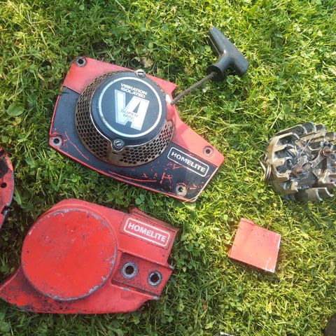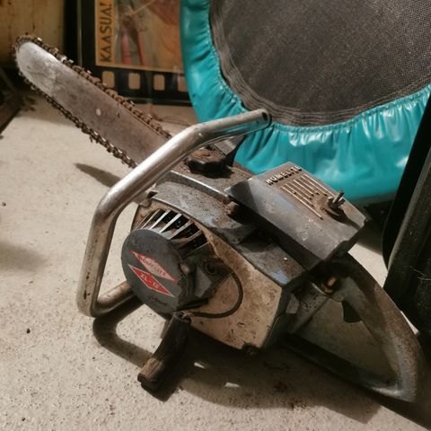 Homelite moottorisaha. Viime loppukesänä käytetty, sen jälkeen ei kokeiltu. Pienellä puhdistuksella tästä näyttävä retrosaha.