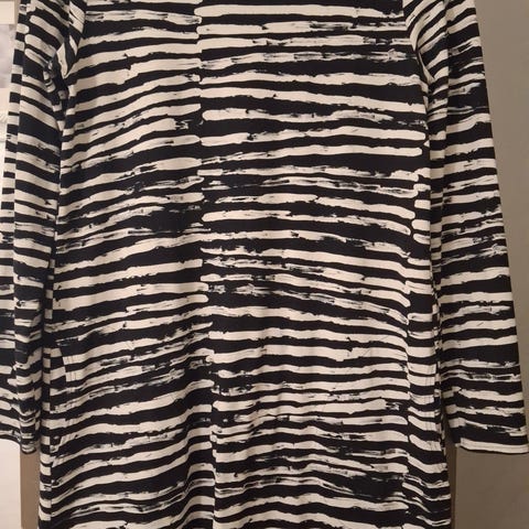 NANSO pusero naisille, koko L. Materiaalina puuvilla. Puserossa on kirjava, raidallinen kuosi ja V-pääntie. Pitkähihainen malli, taskut molemmilla puolilla.