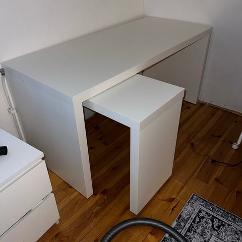 Varastossa pölyttynyt työpöytä. Joitain pieniä jälkiä (näkyy kuvissa). Pitäisi olla kaikki osat tallessa, ruuveja ei. Ikean sivuilta näkee kasattuna :) Vain nouto.