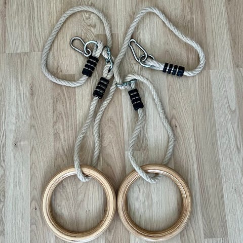 Puusta valmistetut voimistelurenkaat, mukana mustat säädettävät kiinnityshihnat metallisilla kiristimillä. Sopivat esimerkiksi kehonpainoharjoitteluun ja voimisteluliikkeiden tekemiseen sisällä tai ulkona sopivaan telineeseen kiinnitettynä.