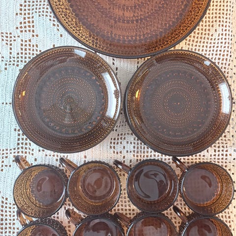 Myydään tarpeettomana vintage Kastehelmi lasit (7kpl), korkeus noin 5cm ja halkaisija 7cm. Lisäksi kaksi pientä Kastehelmi lautasta, halkaisija 8,5cm.