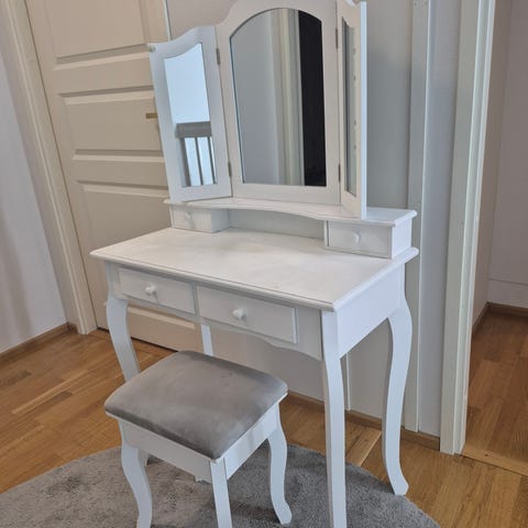 meikkipöytä peilillä ja tuoli. Kaksi kahvaa puuttuu, mutta saatavilla Bauhausissa samanlaisena.