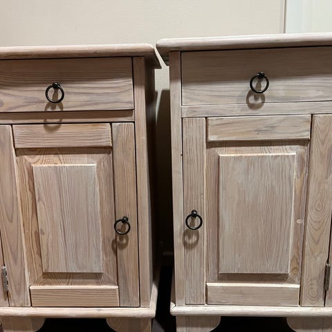 Myydään kuvan yöpöydät uusien tieltä pois. Näköjään ovat vähän erin sävyiset mutta itseä ei ainakaan ole häirinnyt. Muutamia pieniä käytön jälkiä löytyy, mutta yleisilmeeltä siistit.