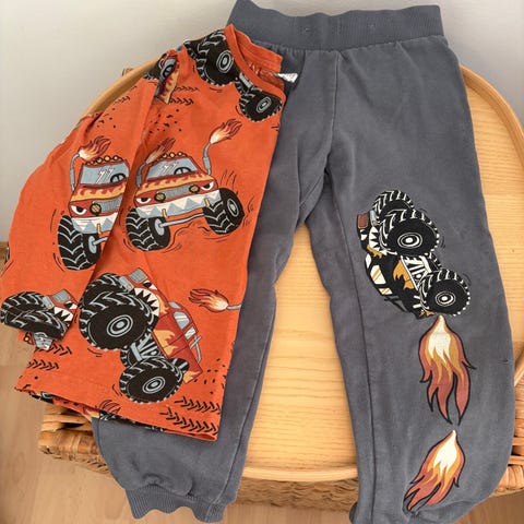 Lindex monster truck aiheinen setti koko 104. Pitkähihainen paita ja pitkälahkeiset housut, joissa säädettävä vyötärö. Housuja käytetty vain muutaman kerran.