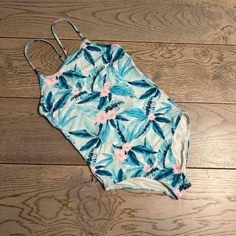KappAhlin musta kokouimapuku, jossa pinkit somisteet selän yläosassa ja lantiolla. Koko 170. Täysin käyttämätön, hintalappu kiinni.