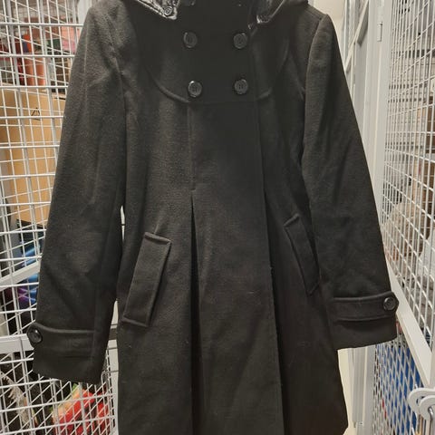Erittäin siisti musta, polvipituinen villakangastakki (80 % villa ja 20 % polyamidi). Vuori polyesteriä. Kaunis leikkaus. Povitasku ja sivutaskut. Merkki ICON.