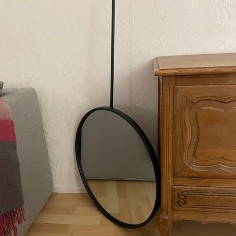 Myydään pyöreä peili, jossa valkoiset kehykset. Halkaisija 59 cm.