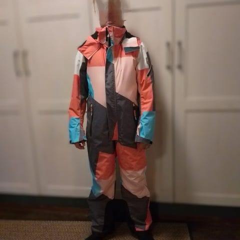 Toisessa polvessa ja takapuolessa näkyy pieniä naarmuja tai kulumaa kankaassa. Hihojen suissa ja polvissa kulumaa, näistä väri haalistunut. Toisessa lahkeen reunassa puhkikulumakohta. Näistä kaikista kuvia. Haalarissa kauttaaltaan hiukan pinttymää, vaaleista kohdista erottuu. Voi olla että pesemällä saa vielä siistimmän. Niskalapussa on nimikointi. Säilytyksestä hiukan ryppyinen.