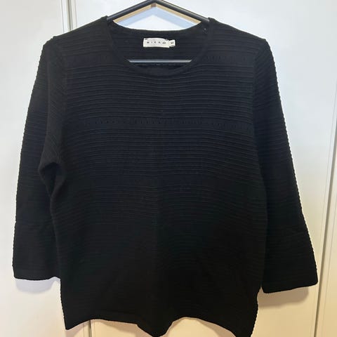 Pitkähihainen neulepusero strukturoidulla, hienorakenteisella neulospinnalla. Pyöreä pääntie, suora malli ja sivuilla vetoketjuyksityiskohdat helmassa. Kunto hyvä.