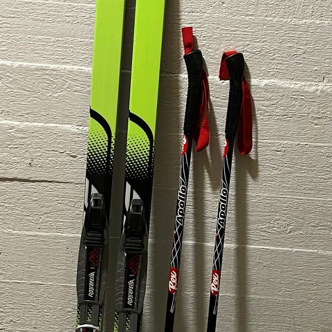 Myydään lasten suksipaketti. Sukset 150 cm, SNS-siteet, sauvat 110 cm.