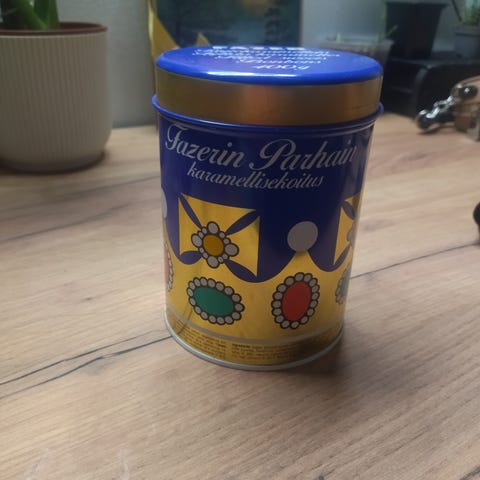 Kuvien mukainen vanha Fazerin pahvinen rasia. Viimeisimmässä kuvassa näkyy kulumisen jälkiä, mutta mielestäni kohtalainen kunto ikäänsä nähden. Pituus 26 cm, leveys 21cm. Koristeena minulla ollut, nyt joutaa eteenpäin 😊